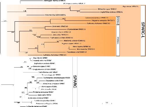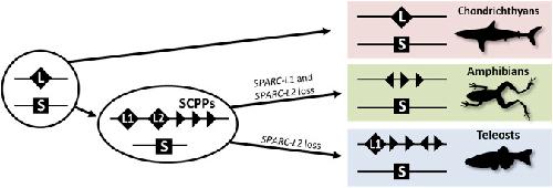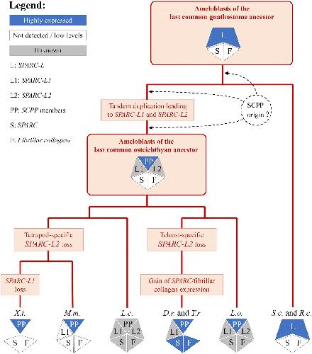 Evolution of dental tissue mineralization: an analysis of the jawed vertebrate SPARC and SPARC-L families. , Enault S, Muñoz D, Simion P, Ventéo S, Sire JY, Marcellini S , Debiais-Thibaud M., BMC Evol Biol. August 30, 2018; 18 (1): 127.