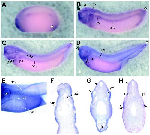 Comparative analysis of embryonic gene expression defines potential interaction sites for Xenopus EphB4 receptors with ephrin-B ligands., Helbling PM, Saulnier DM, Robinson V, Christiansen JH, Wilkinson DG, Brändli AW., Dev Dyn. December 1, 1999; 216 (4-5): 361-73.