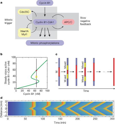 Building a cell cycle oscillator: hysteresis and bistability in the activation of Cdc2., Pomerening JR, Sontag ED, Ferrell JE., Nat Cell Biol. April 1, 2003; 5 (4): 346-51.