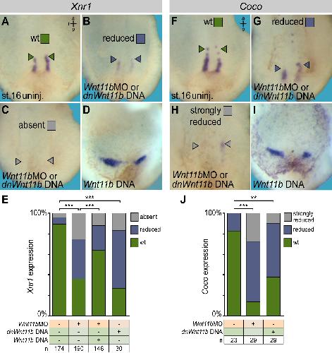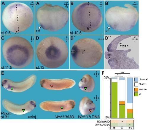 Wnt11b is involved in cilia-mediated symmetry breakage during Xenopus left-right development., Walentek P, Schneider I, Schweickert A, Blum M., PLoS One. January 1, 2013; 8 (9): e73646. |