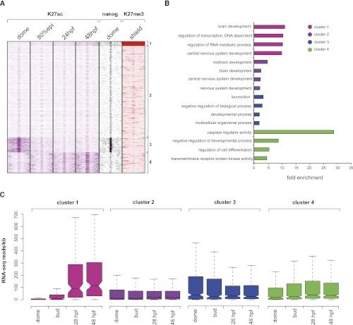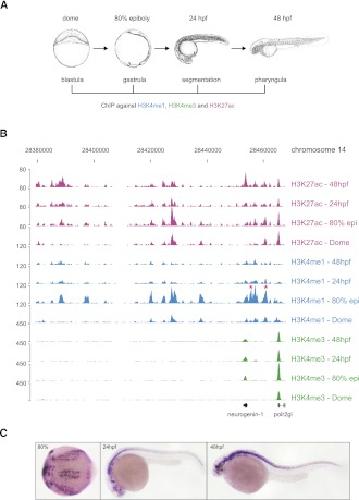 Dynamics of enhancer chromatin signatures mark the transition from pluripotency to cell specification during embryogenesis. , Bogdanovic O, Fernandez-Miñán A, Tena JJ, de la Calle-Mustienes E , Hidalgo C, van Kruysbergen I, van Heeringen SJ, Veenstra GJ , Gómez-Skarmeta JL ., Genome Res. October 1, 2012; 22 (10): 2043-53.