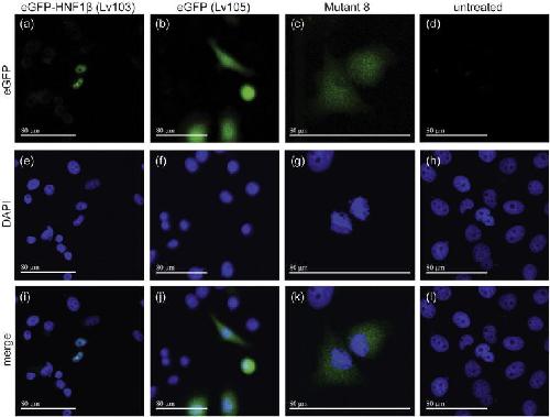 Structural and calorimetric studies demonstrate that the hepatocyte nuclear factor 1β (HNF1β) transcription factor is imported into the nucleus via a monopartite NLS sequence., Wiedmann MM, Aibara S, Spring DR, Stewart M, Brenton JD., J Struct Biol. September 1, 2016; 195 (3): 273-281. |
