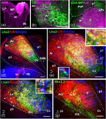 Pallial origin of mitral cells in the olfactory bulbs of Xenopus., Moreno N, Bachy I, Rétaux S, González A., Neuroreport. December 19, 2003; 14 (18): 2355-8.