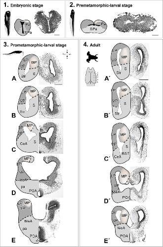 Characterization of the bed nucleus of the stria terminalis in the forebrain of anuran amphibians., Moreno N, Morona R, López JM, Domínguez L, Joven A, Bandín S, González A., J Comp Neurol. February 1, 2012; 520 (2): 330-63.