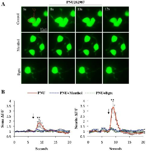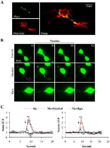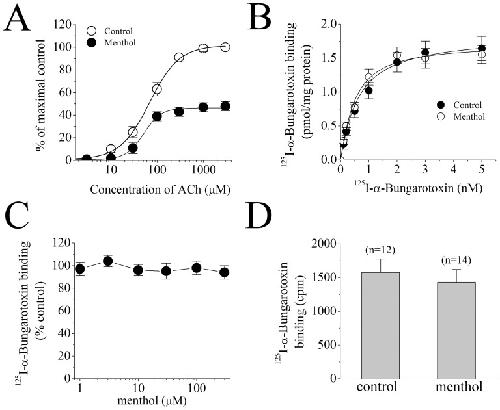 Menthol binding and inhibition of α7-nicotinic acetylcholine receptors., Ashoor A, Nordman JC, Veltri D, Yang KH, Al Kury L, Shuba Y, Mahgoub M, Howarth FC, Sadek B, Shehu A, Kabbani N, Oz M., PLoS One. January 1, 2013; 8 (7): e67674. |