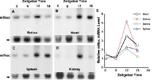 Rhythmic expression of Nocturnin mRNA in multiple tissues of the mouse. , Wang Y, Osterbur DL, Megaw PL, Tosini G, Fukuhara C, Green CB , Besharse JC ., BMC Dev Biol. January 1, 2001; 1 9.