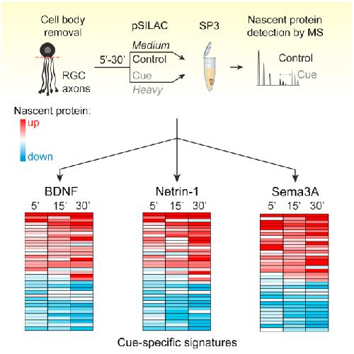 Rapid Cue-Specific Remodeling of the Nascent Axonal Proteome., Cagnetta R, Frese CK, Shigeoka T, Krijgsveld J, Holt CE., Neuron. July 11, 2018; 99 (1): 29-46.e4. |