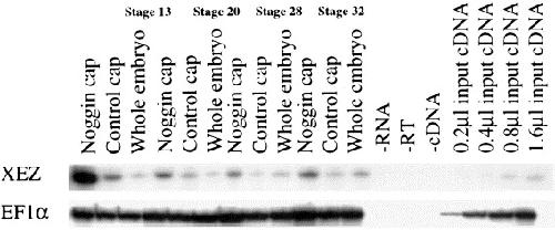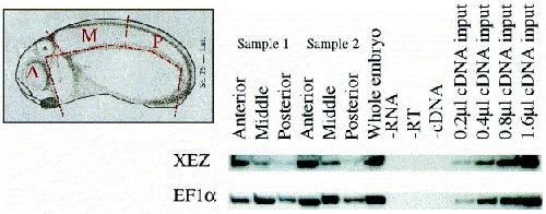 Xenopus Enhancer of Zeste ( XEZ); an anteriorly restricted polycomb gene with a role in neural patterning. , Barnett MW, Seville RA, Nijjar S, Old RW , Jones EA ., Mech Dev. April 1, 2001; 102 (1-2): 157-67.