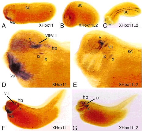 Hox11-family genes XHox11 and XHox11L2 in xenopus: XHox11L2 expression is restricted to a subset of the primary sensory neurons., Patterson KD, Krieg PA., Dev Dyn. January 1, 1999; 214 (1): 34-43.