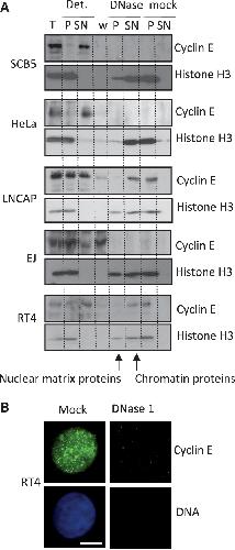 Cyclin E is recruited to the nuclear matrix during differentiation, but is not recruited in cancer cells., Munkley J, Copeland NA, Moignard V, Knight JR, Greaves E, Ramsbottom SA, Pownall ME, Southgate J, Ainscough JF, Coverley D., Nucleic Acids Res. April 1, 2011; 39 (7): 2671-7.