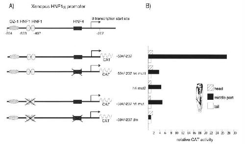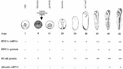 The embryonic expression of the tissue-specific transcription factor HNF1alpha in Xenopus: rapid activation by HNF4 and delayed induction by mesoderm inducers. , Nastos A, Pogge von Strandmann E, Weber H, Ryffel GU ., Nucleic Acids Res. December 15, 1998; 26 (24): 5602-8.