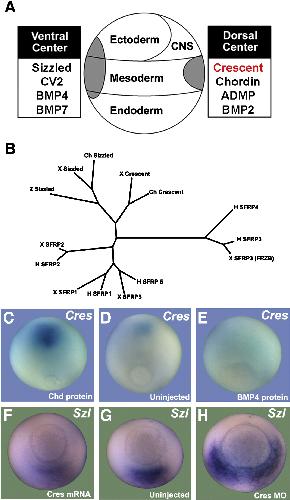 Dorsal-ventral patterning: Crescent is a dorsally secreted Frizzled-related protein that competitively inhibits Tolloid proteases., Ploper D, Lee HX, De Robertis EM., Dev Biol. April 15, 2011; 352 (2): 317-28.