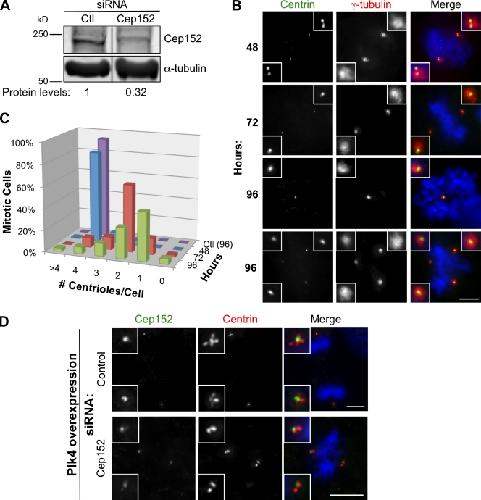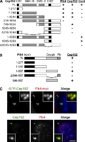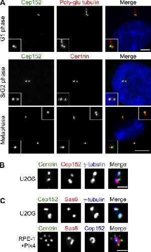 Cep152 interacts with Plk4 and is required for centriole duplication. , Hatch EM, Kulukian A, Holland AJ, Cleveland DW, Stearns T ., J Cell Biol. November 15, 2010; 191 (4): 721-9.