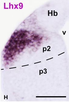 The lhx9 gene encodes a lim-homeodomain transcription factor localized to the nucleus. Its expression is detected in the developing habenula, hypothalamus, and pineal complex. The protein functions as ...[+]