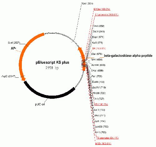 | Vector Details | Vector Map | Name: pBluescript KS+ Type: phagemid 5' Restriction Site: EcoRI 3' Restriction Site: NotI |