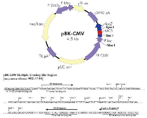 | Vector Details | Vector Map | Name: pBK-CMV Type: phagemid 5' Restriction Site: EcoRI 3' Restriction Site: XhoI |