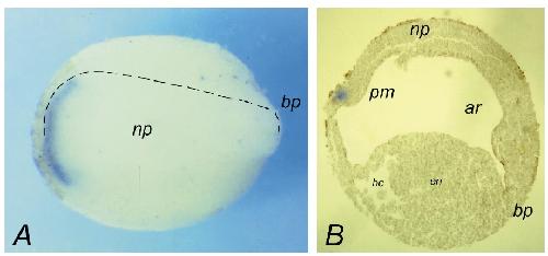 plate (np), blastoporus (bp) to the right. (B) Histological mid-sagittal section. ar, archenteron; bc, blastocoel; pm, precordal mesoderm.