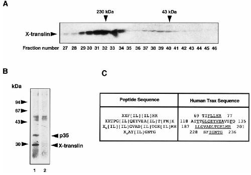 FIG. 3. (A) Side-by-side analysis by Western blotting with a-X-translin antibodies of consecutive fractions (30 ml loaded), after