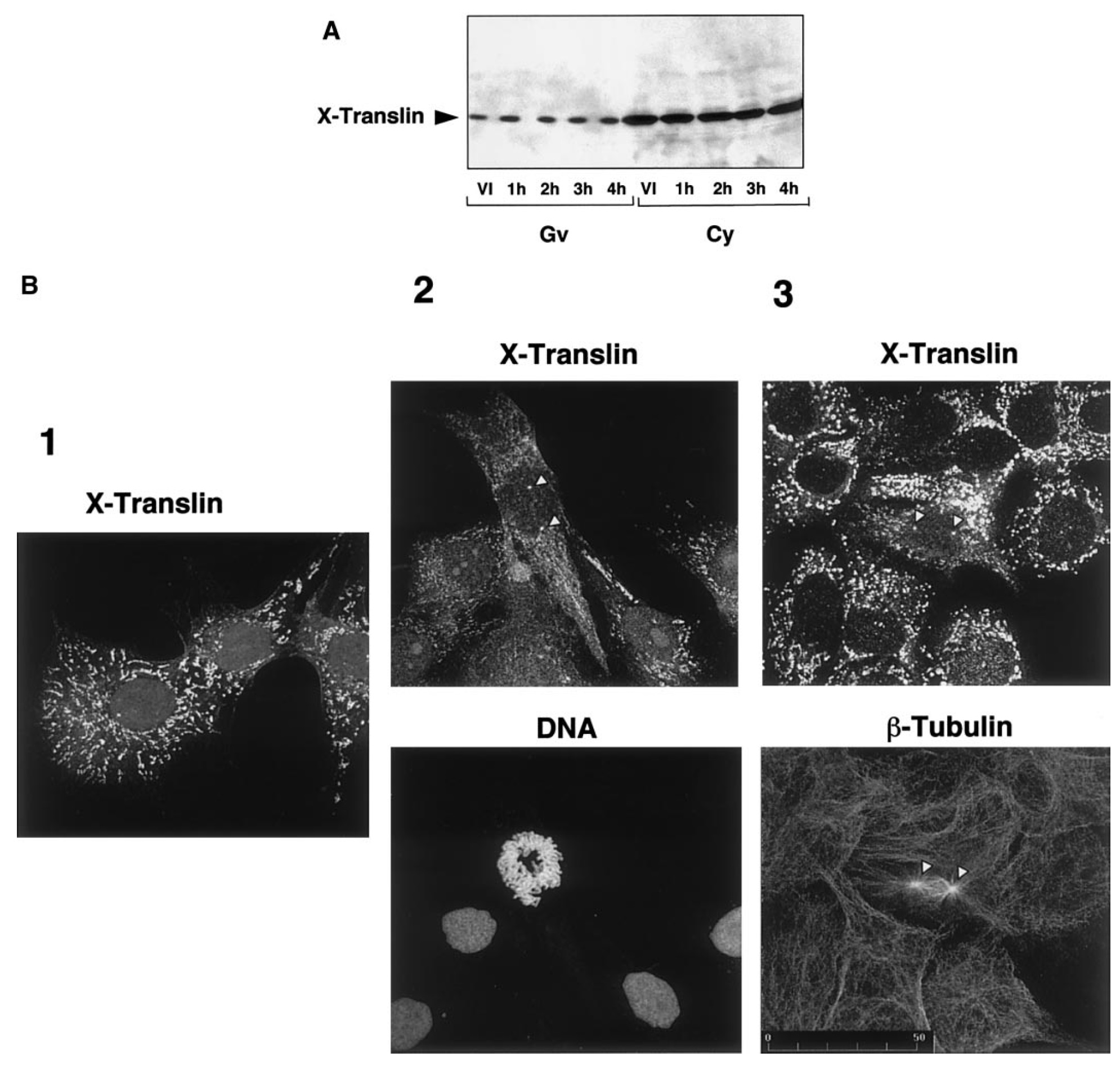 (B) Subcellular localisation of X-translin in XTC cells. Single a-X-translin immunofluorescence in interphase cell (1, X-translin) and