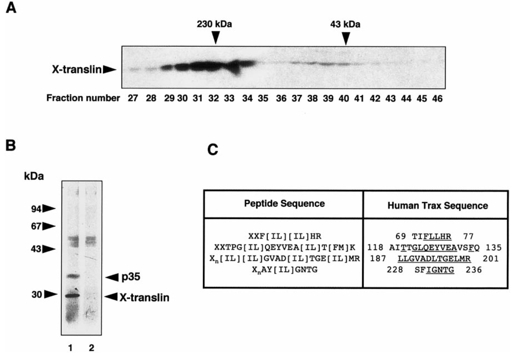 saturated with the antigen peptide encoding the C-terminal sequence of X-translin. (C) Amino acid sequences of the proteolytic fragments