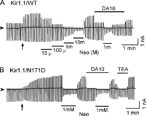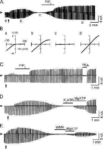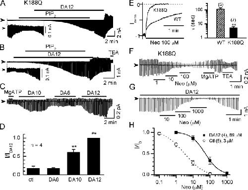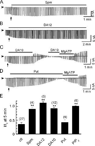 Phosphatidylinosital-4,5-bisphosphate (PIP2) acts as an essential factor regulating the activity of all Kir channels. In most Kir members, the dependence on PIP2 is modulated by other factors, such as protein kinases (in Kir1), G(betagamma) (in Kir3), and the sulfonylurea receptor (in Kir6). So far, however, no regulator has been identified in Kir2 channels. Here we show that polyamines, which cause inward rectification by selectively blocking outward current, also regulate the interaction of PIP2 with Kir2.1 channels to maintain channel availability. Using spermine and diamines as polyamine analogs, we demonstrate that both spontaneous and PIP2 antibody-induced rundown of Kir2.1 channels in excised inside-out patches was markedly slowed by long polyamines; in contrast, polyamines with shorter chain length were ineffective. In K188Q mutant channels, which have a low PIP2 affinity, application PIP2 (10 microM) was unable to activate channel activity in the absence of polyamines, but markedly activated channels in the presence of long diamines. Using neomycin as a measure of PIP2 affinity, we found that long polyamines were capable of strengthening either the wild type or K188Q channels' interaction with PIP2. The negatively charged D172 residue inside the transmembrane pore region was critical for the shift of channel-PIP2 binding affinity by long polyamines. Sustained pore block by polyamines was neither sufficient nor necessary for this effect. We conclude that long polyamines serve a dual role as both blockers and coactivators (with PIP2) of Kir2.1 channels.