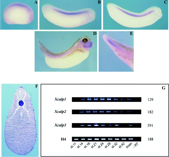We isolated three Xenopus cDNA clones, Xcalp1, Xcalp2 and Xcalp3, which encode different forms of calpastatin mRNA. Compared to the canonical form of mammalian calpastatin, the predicted Xcalp3 protein contained a very long N-terminal domain L and an additional inhibitory domain. The other two deduced calpastatin proteins were truncated forms, both lacking domain L and containing four (Xcalp2) and two (Xcalp1) inhibitory domains, respectively. The presence of Xcalp1, Xcalp2 and Xcalp3 transcripts was detected by in situ hybridization in the notochord from the embryonic stage 20 to stage 36, afterwards the expression was only present in the growing tailbud. As shown by RT-PCR, the three calpastatin mRNAs were also expressed in the adult brain.