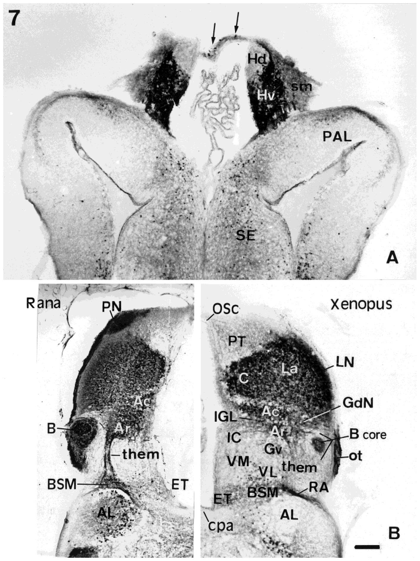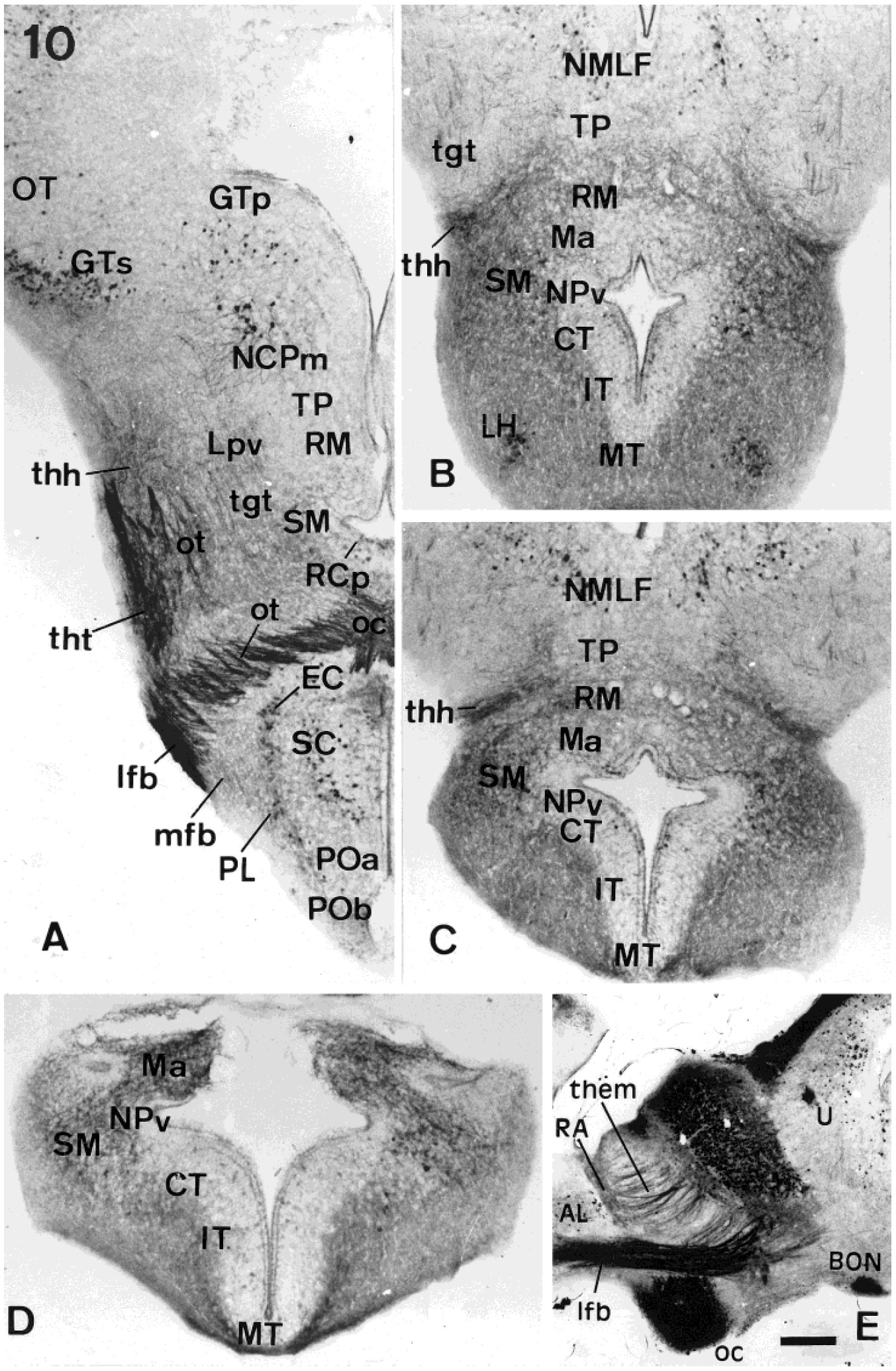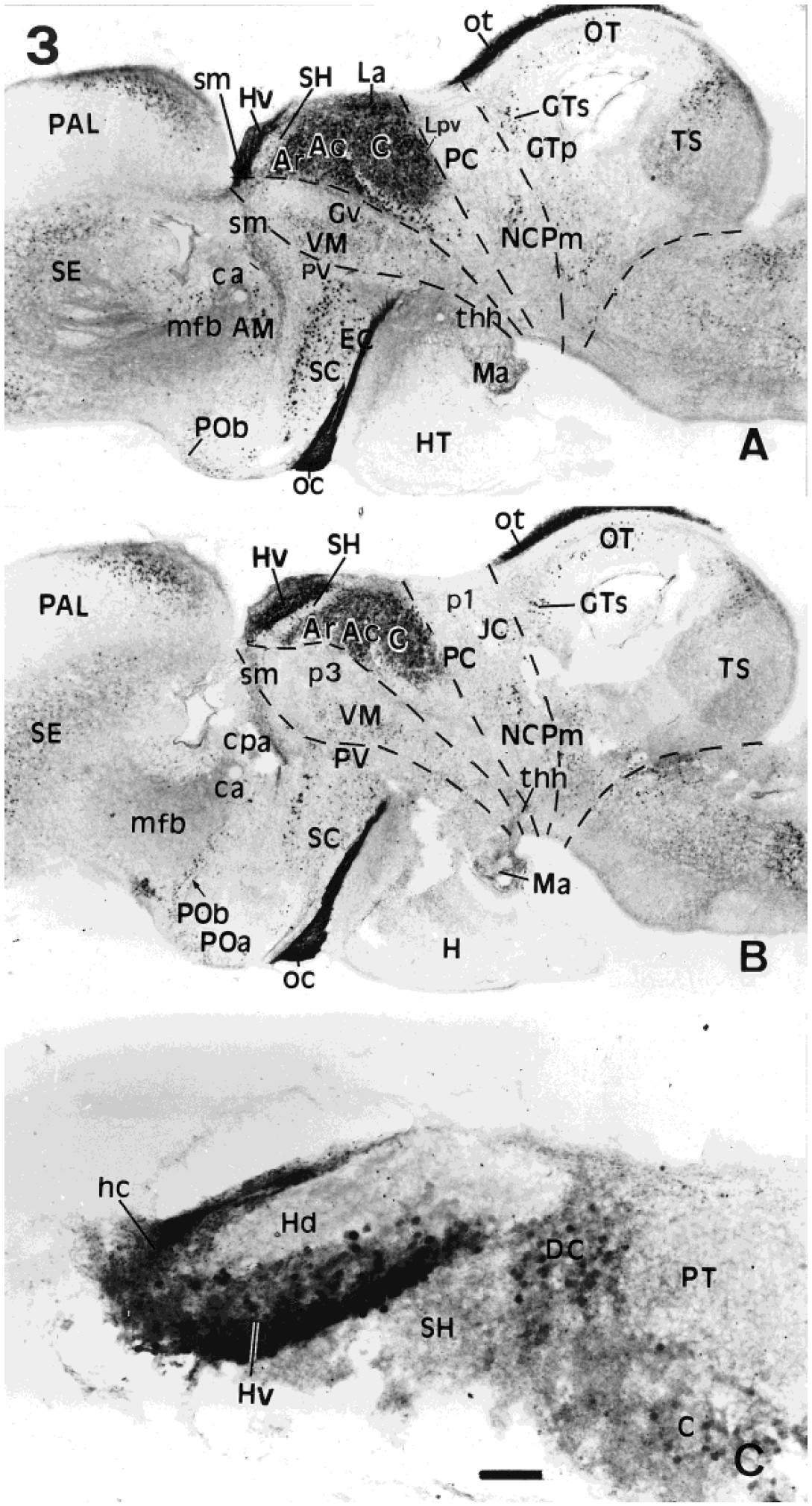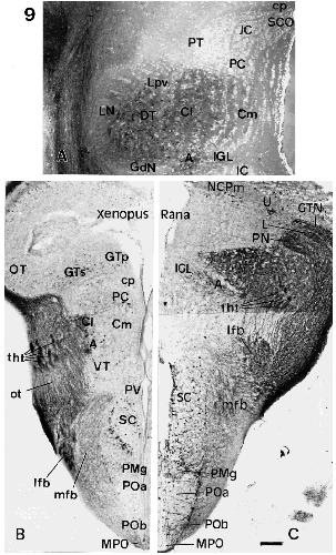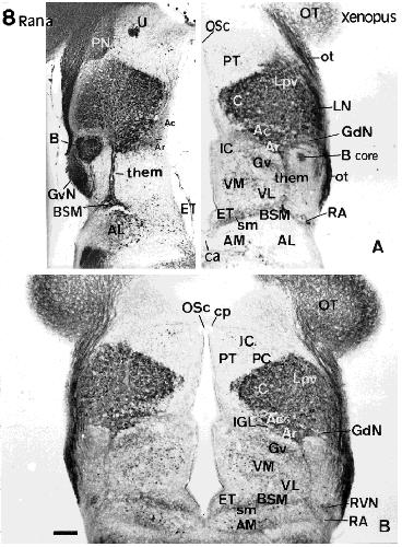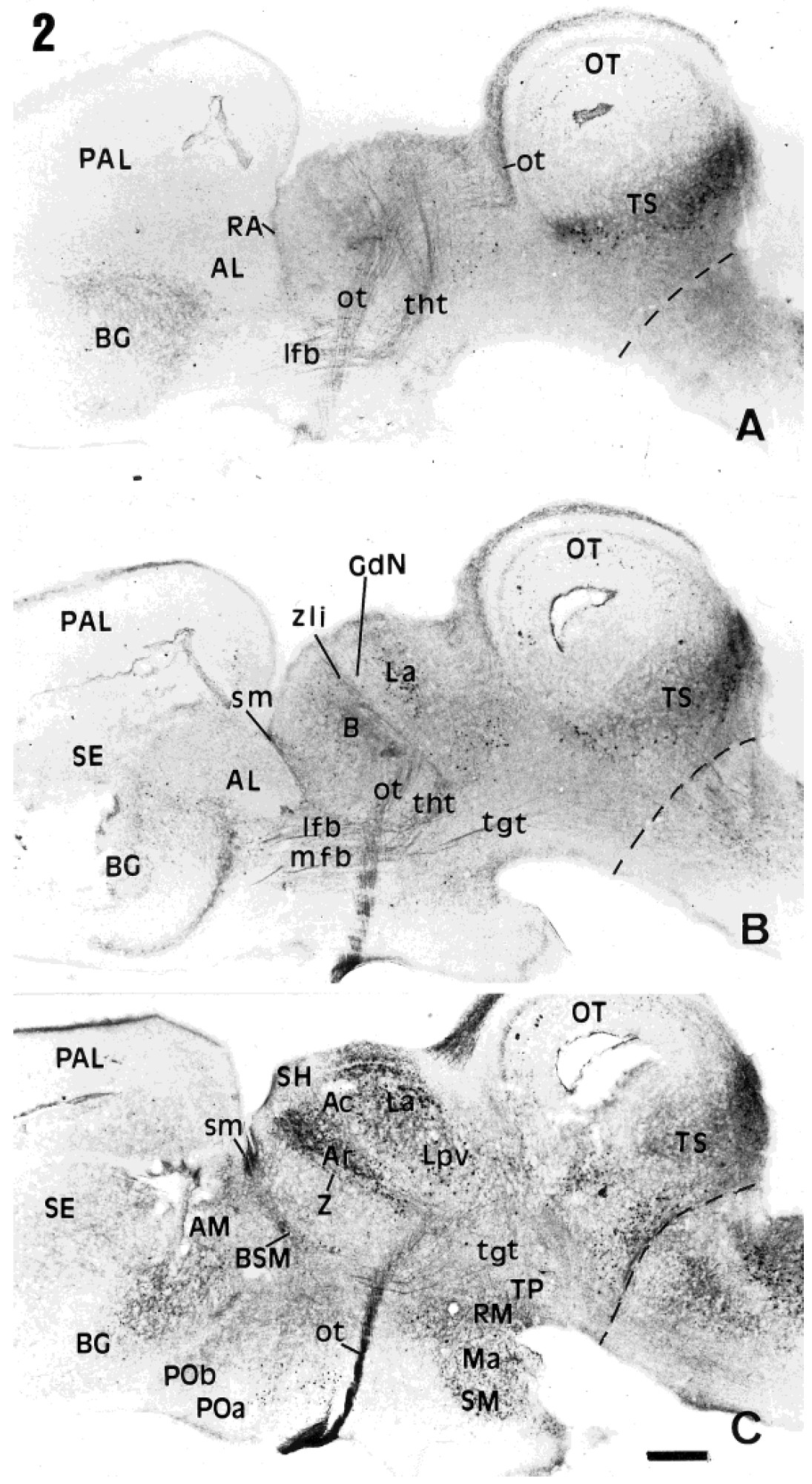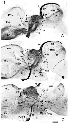 Patterns of calretinin, calbindin, and tyrosine-hydroxylase expression are consistent with the prosomeric map of the frog diencephalon.
