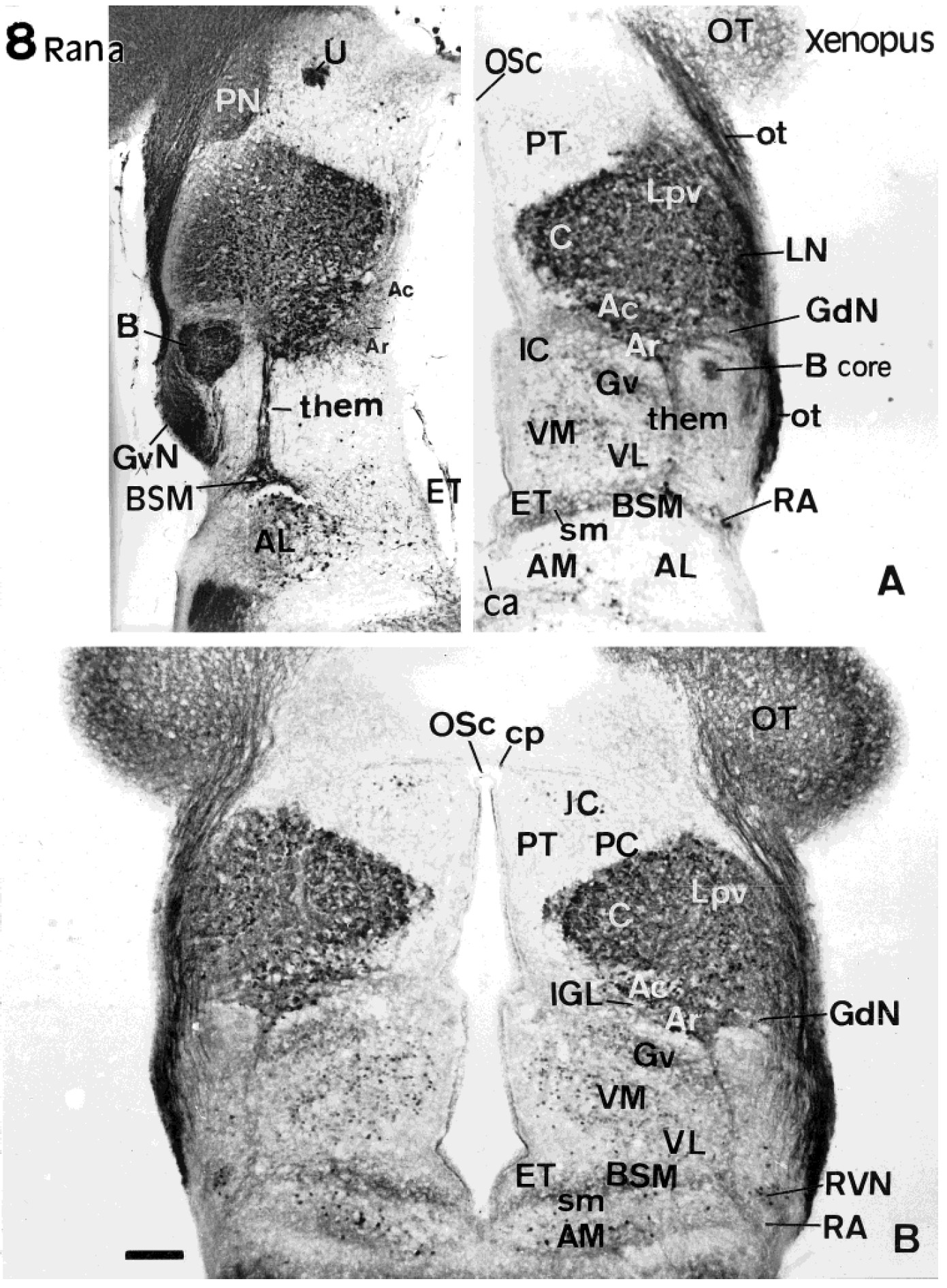 This paper re-examines a previously published segmental map of the frog diencephalon (Puelles et al. [1996] Brain Behav.Evol. 47:279-310) by means of immunocytochemical mapping of calretinin, calbindin, and tyrosine hydroxylase. The distribution of neuronal populations, axon tracts, and neuropils immunoreactive for these markers was studied in adult specimens of Rana perezi and Xenopus laevis sectioned sagittally or horizontally. Emphasis was placed on study of the relationship of observed chemoarchitectural boundaries with the postulated overall prosomeric organization and the schema of nuclear subdivisions we reported previously, based on acetylcholinesterase histochemistry and Nissl pattern in Rana. The data reveal a large-scale correspondence with the segmental map in both species, although some differences were noted between Rana and Xenopus. Notably, retinorecipient neuropils were generally immunoreactive for calretinin only in Rana. Importantly, calretinin immunostaining underlines particularly well the transverse prosomeric boundaries of the dorsal thalamus. A number of nuclear subdivisions noted before with AChE were corroborated, and some novel subdivisions became apparent, particularly in the anterior nucleus of the dorsal thalamus and in the habenular complex. The mapping of tyrosine hydroxylase clarified the segmental distribution of the catecholaminergic cell groups in the frog forebrain, which is comparable to that observed in other vertebrates.