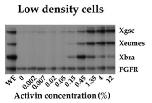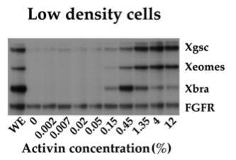 Fig. 2. RNase protection analysis of gene expression under low density culture conditions. Xbra is activated maximally at 0.45% activin. Xgsc and Xeomes reach maximum activation at 1.35% activin. WE, whole embryo.