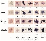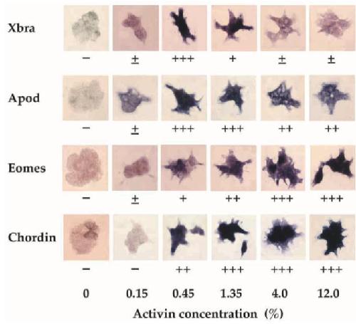 (as in Fig. 1C) were in situ-hybridized to the probes stated (Xbra, Xapod, Xeomes and Xchordin). The colour reaction is BM purple. Each figure shows a representative clonal colony of 1-4 cells, fixed at stage 10.5. The + or â values under each figure are based on densitometry readings (see Materials and Methods). â, background value; ±, density value 2; +, ++, +++, density values 3, 4 and 5 or more respectively (see Fig. 6). Altogether seven independent experimental series gave results similar to these (see text)