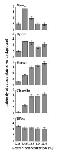 Fig. 6. Summary of in situ hybridization results with low density cell preparations on a fibronectin substrate. For each probe and for each concentration, 40 single cells were scored for the intensity of stain (see Materials and Methods). The cells scored were present as single cells or in clonal colonies of 2-4 cells, but the density of stain was recorded over single cells. Standard deviations are shown. These results derive from three independent experimental series.