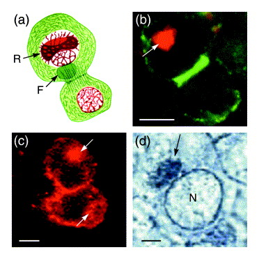 Organelle aggregates in cyst-forming cells. (a) Drawing of a dividing cystoblast from the ovary of the water beetle Dytiscus (originally from Ref. 52; this image was redrawn in Ref. 53). The fusome (F) and an oocyte-specific ring of rDNA (R) segregate to the same cell at cytokinesis. (b) A round fusome shown in red (arrow) in a dividing Drosophila germ cell (image reproduced, with permission, from Ref. 24). (c) Two mouse germ cells from a 10.5 days post coitum (dpc) mouse genital ridge stained with EMA, a germ cell marker labelling a sphere in the cytoplasm. (d) One oocyte from a 16-cell Xenopus nest that shows the location of the mitochondrial cloud precursor (arrow) and the nucleus (N; image reproduced, with permission, from Ref. 23). Bars, 8 μm.