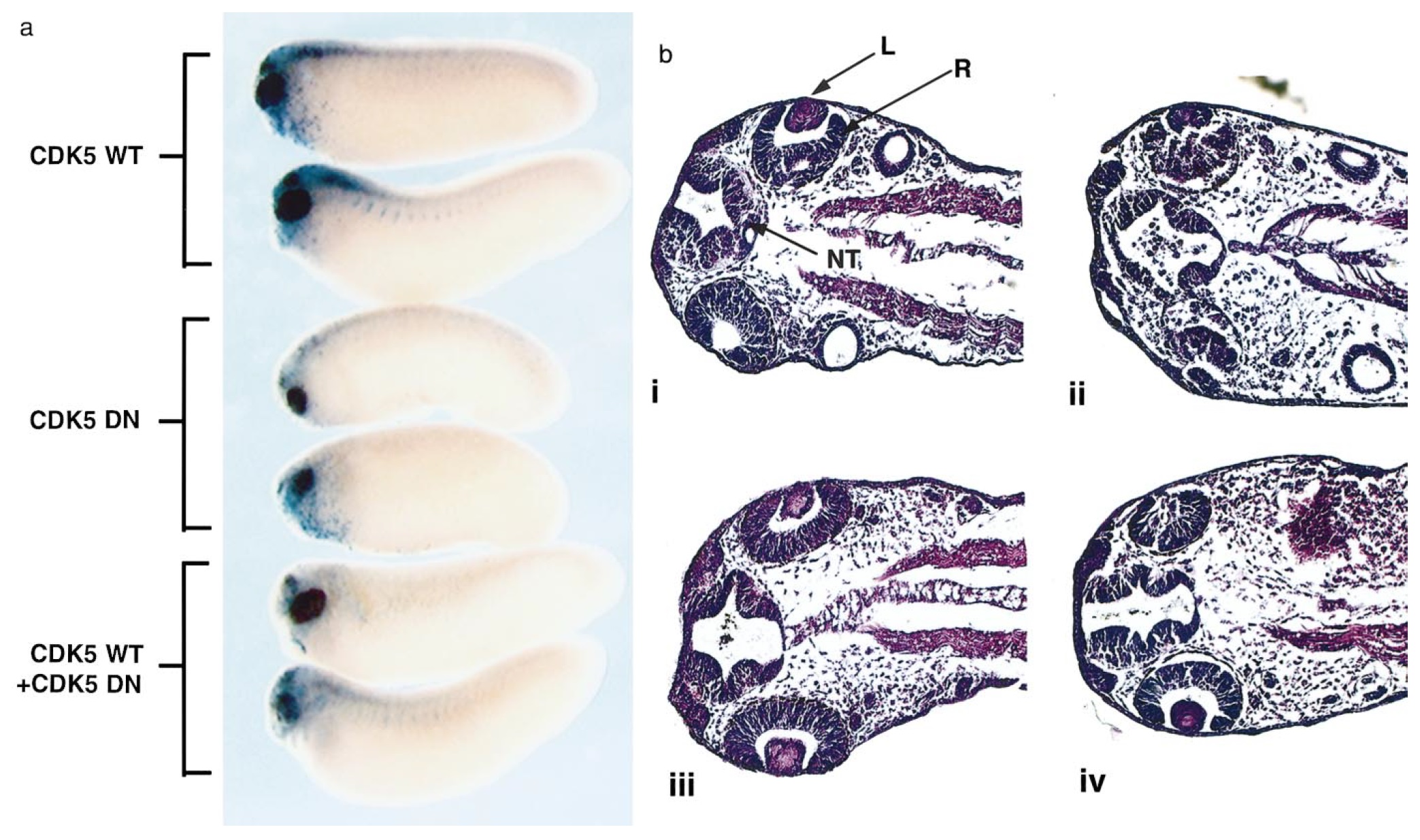 disruption of the embryonic eye. Embryos were left uninjected (i) or injected with RNA encoding cdk5 DN (5 ng, ii), cdk5 WT (5 ng, iii), or cdk5