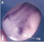 trigeminal ganglion (TG) is highlighted with an arrow. (B) A section through the head of a stage 35/36 embryo where Xp35.2 expression has