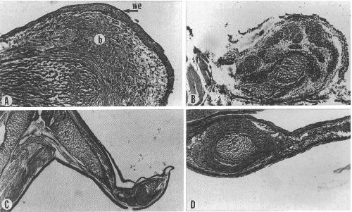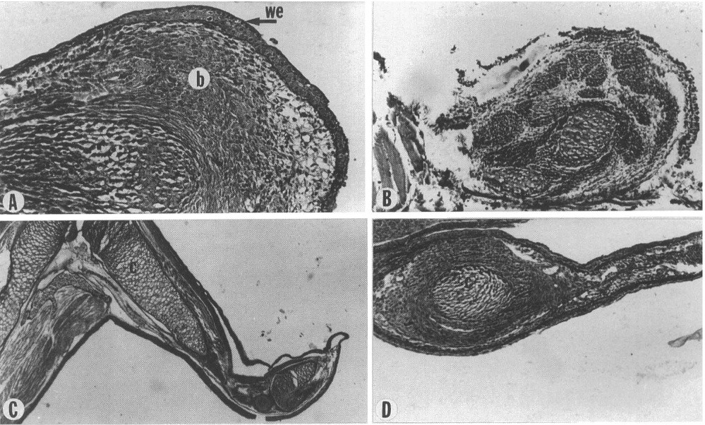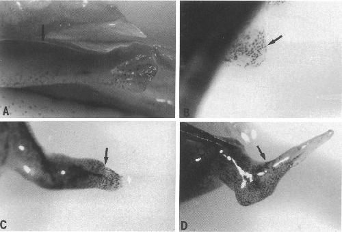 During outgrowth of the developing limb, signals from the apical ectodermal ridge, such as fibroblast growth factors, are paramount for limb patterning. Similarly, fibroblast growth factor molecules and their receptors are synthesized in the wound epithelium of the regenerating limb blastema, implicating an analogous function to limb development. To address this issue further and to understand the role of fibroblast growth factor receptor signaling in limb regeneration, we have examined the expression patterns of x-fibroblast growth factor receptors-1, -2, -3, -4a, and -4b in Xenopus laevis. This amphibian model provides a system in which both regenerating (premetamorphic; tadpole or larva stage) and nonregenerating (postmetamorphic; froglet stage) hindlimbs can be studied. In premetamorphic hindlimbs (stage 53), all of the receptors were expressed in the wound epithelium and the underlying mesenchyme. In postmetamorphic limbs (stage 61), however, transcripts for x-fibroblast growth factor receptors-1 and -2 were absent from the wound epithelium. The expression results for x-fibroblast growth factor receptors-1 and -2 were corroborated at the protein level by employing specific antibodies. Thus, it appears that expression of both fibroblast growth factor receptors-1 and -2 is associated with the ability for limb regeneration. The role of these receptors in regeneration was further investigated by using specific inhibitors to fibroblast growth factor receptors during premetamorphic hindlimb regeneration. These compounds inhibited the normal limb outgrowth and resulted, in the majority of the cases, in outgrowths of cones or spikes reminiscent of growth that is seen in amputated postmetamorphic limbs. Thus, fibroblast growth factor receptors-1 and -2 expression and function should be regarded as paramount for the ability of limb regeneration in Xenopus.