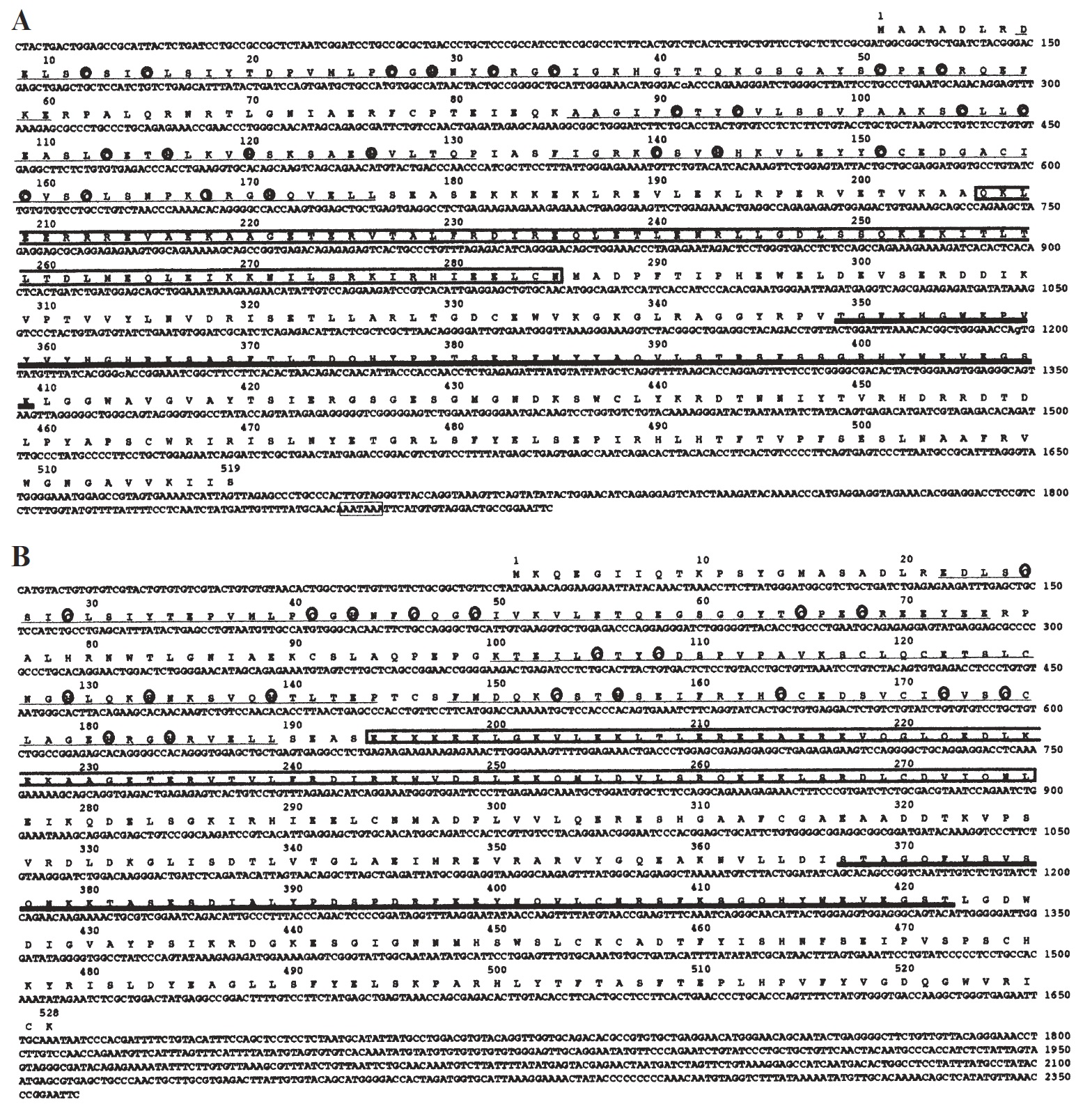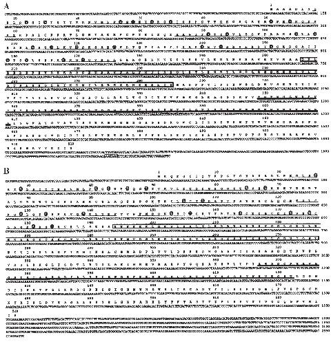 Fig. 1. Nucleotide and deduced amino acid sequences of XL43 (Fig. 2) and XL75 (Fig. 3) determined from pBluescript cDNA clones. Five regions