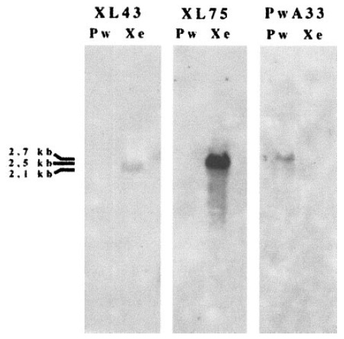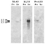 XL43 and XL75. Bands at #2.5 kb (XL75) and #2.1 kb (XL43) are