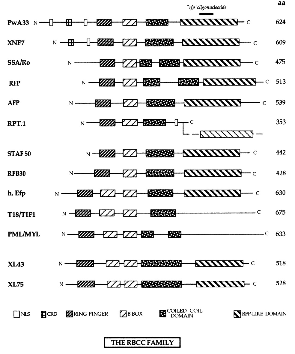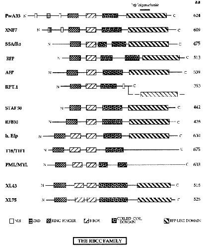 Fig. 3. Diagrammatic representation of the conserved zinc fingers, coiled coil domain and the rfp-like domain in the RBCC-containing family.
