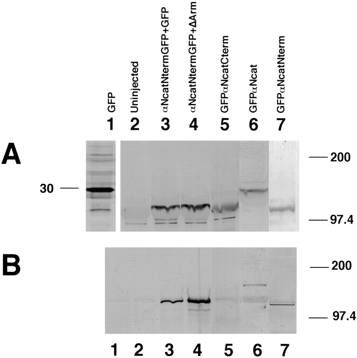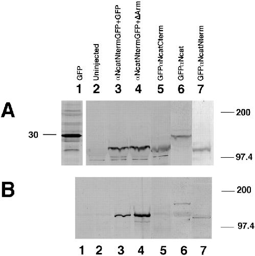 Figure 2. Expression of α-cateninâGFP fusion proteins in Xenopus embryos and the localization of the β-catenin binding site. (A) Expression of proteins detected by anti-GFP. (B) After immunoprecipitations with antiâβ-catenin, associated α-catenin was detected using anti-GFP. In both A and B, the numbering is as follows: lane 1, GFP injected; lane 2, uninjected; lane 3, αNcatNtermGFP + GFP; lane 4, αNcatNtermGFP + ÎArm; lane 5, GFPαNcatCterm; lane 6, GFPαNcat; lane 7, GFPαNcatNterm. Note that GFPαNcatCterm, the protein lacking the NH2 terminus of αN-catenin, does not bind to β-catenin (B, lane 5). Results show that the presence of GFP does not prevent α-catenin binding to β-catenin, provided that the NH2-terminal binding domain is present. In addition, coexpression of ÎArm does not affect expression levels. In each case, 1.5 ng total RNA was injected into one blastomere at the two-cell stage. |