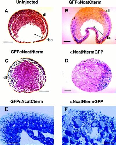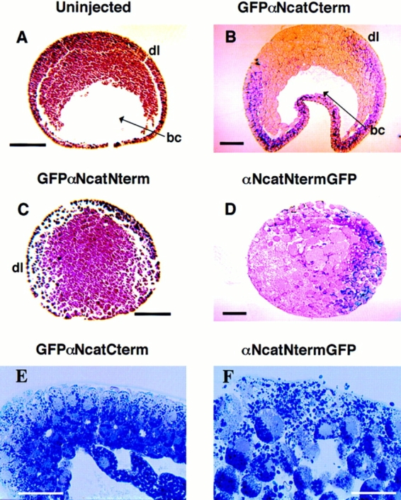 Figure 6. Histology of gastrulating embryos expressing α-catenin– GFP fusion proteins. Stage 10–11 embryos were fixed in MEMFA and imbedded in paraplast (A and C) or plastic (B, D, E, and F) for sectioning. Arrowheads point to the blastocoel (bc). The abbreviation dl denotes the presumptive dorsal side of the embryos. (A) An uninjected normal embryo. (B) An embryo injected with GFPαNcatCterm mRNA, (C) αNcatNtermGFP, and (D) GFPαNcatNterm. Embryos expressing αNcatNtermGFP completely lack the blastocoel and are disorganized compared to normal embryos. Also noticeable is the lack of integrity of the ectodermal layers in the two mutants. Higher magnification emphasizes the disorganization of cells in an embryo expressing αNcatNtermGFP compared to a normal embryo expressing GFPαNcatCterm. mRNA was injected into the animal pole of both cells of two cell embryos. Bars: (A–D) 200 μm; (E and F) 100 μm. |