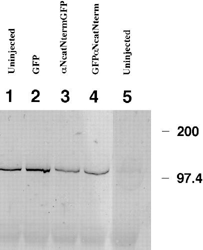 Figure 4. ΔArm binds α-catenin– GFP fusion proteins. The 9E10 monoclonal antibody that recognizes the myc tag on ΔArm was used to immunoprecipitate, and anti-GFP was used with subsequent immunoblotting to detect α-catenin–GFP fusion proteins in the precipitates. Embryos were coinjected with 0.3 ng of the first mRNA and 1.2 ng of the second. First lane, GFP + ΔArm; second lane, αNcatNtermGFP + ΔArm; third lane, uninjected. |