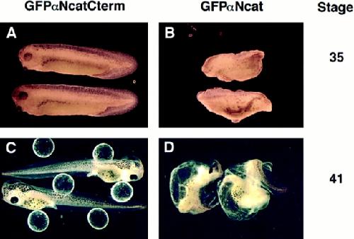 Figure 11. Full-length α-catenin can antagonize the endogenous induction of a dorsoanterior axis when expressed in dorsal blastomeres. 3.0 ng of either GFPαNcatCterm, which does not bind to β-catenin, or GFPαNcat, the full-length construct, were injected into both dorsal blastomeres of four-cell embryos. Embryos expressing GFPαNcat often develop the ventralized phenotypes illustrated here (B and D), with no anterior head structures present. Embryos expressing high levels of GFPαNcatCterm develop normally (A and C). Two stages are shown. |