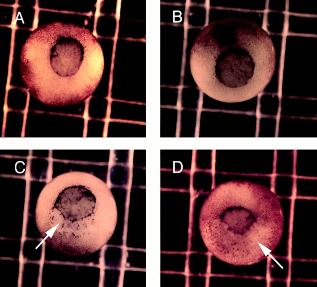 Figure 3. Mutants lacking the COOH terminus of αN-catenin result in severe gastrulation defects. (A) GFPαNcat-injected embryos develop normally. (B) GFPαNcatCterm-expressing embryos develop normally. (C and D) Both αNcatNtermGFP- and GFPαNcatNterm-injected mRNAs induce defects beginning at stage 10, here shown by rips (arrows) occurring at the dorsal lips of the embryos. Embryos are shown with the ventral side toward the top. mRNA was injected into the animal pole of one cell of two-cell embryos. |