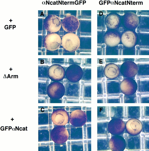 Figure 5. ΔArm and GFPαNcat rescue the defects caused by dominant-negative α-catenin mutants. (A, B, and C) αNcatNtermGFP + GFP, ΔArm, or GFPαNcat, respectively. (D–F) GFPαNcatNterm + GFP, ΔArm, or GFPαNcat. In all cases, 0.3 ng of αNcatNtermGFP or GFPαNcatNterm mRNA was coinjected with 1.2 ng of the second mRNA. Mutants in A and D do not develop further than gastrulation. Rescued mutants gastrulate (B and C, and E and F) and continue to develop normally. mRNA was injected into the animal pole of one cell of two-cell embryos. |
