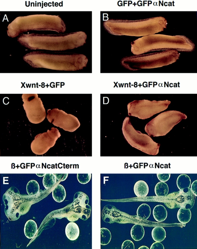 Figure 10. Coexpression of α-catenin diminishes the dorsalizing effects of Xwnt-8 and β-catenin. (A) Noninjected normal tadpoles. (B) Embryos expressing GFP + GFPαNcat. (C) Embryos expressing Xwnt-8 + GFP. (D) Xwnt-8 + GFPαNcat. (E) β-catenin + GFPαNcatCterm. (F) β-catenin + GFPαNcat. Embryos coexpressing α-catenin with Xwnt-8 develop longer trunks and are less dorsalized than embryos coexpressing GFP. Embryos ventrally expressing GFPαNcat + GFP develop normally (B). GFPαNcat antagonizes the induction of a secondary dorsoanterior axis by β-catenin (F). In BâD, embryos were coinjected with 0.125 ng of the first mRNA and 3 ng of the second. In E and F, 0.2 ng of β-catenin mRNA was coinjected with 3.0 ng of the αN-catenin constructs. One ventral blastomere was injected in each four-cell embryo. 1-mm glass beads hold the embryos upright. |
