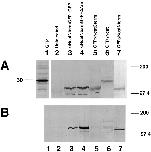 Figure 7. Redistribution of GFPαNcatNterm and αNcatNtermGFP from the glycoprotein fraction to the soluble fraction by ΔArm. (A) Soluble fractions immunoblotted with the anti-GFP polyclonal antibody. (B) Glycoprotein fractions immunoblotted with the anti-GFP polyclonal antibody. Lanes in both cases are 1, uninjected; 2, GFP injected; 3, GFPαNcatCterm injected; 4, αNcatNtermGFP + GFP; 5, αNcatNtermGFP + ΔArm; 6, GFPαNcatNterm + GFP; 7, GFPαNcatNterm + ΔArm; 8, GFPαNcat. Note the decrease in B between lanes 4 and 5 and lanes 6 and 7, implying that ΔArm acts by binding to the α-catenin mutants, keeping them from binding to the cadherin complex. When coinjections were done, 0.3 ng of the first mRNA was coninjected with 1.2 ng of the second mRNA. |