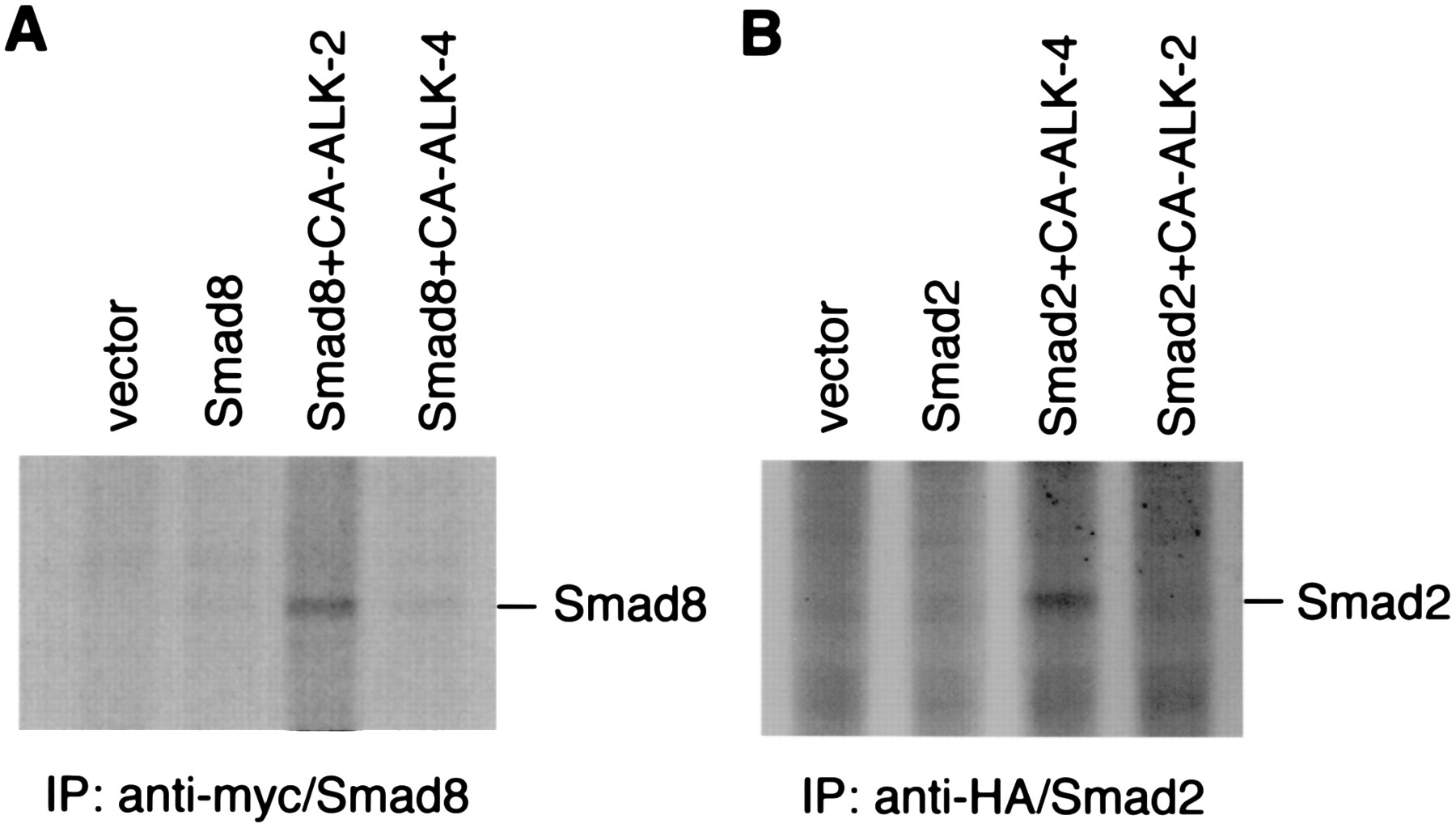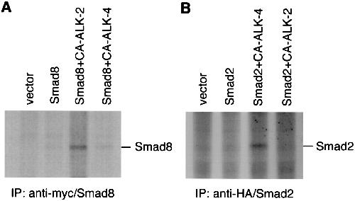 CA ALK-2 specifically phosphorylates Smad8. (A) CA ALK-2 but not CA ALK-4 phosphorylates Smad8. CHO cells were transiently transfected with control vector (pcDNA3), myc/Smad8, or myc/Smad8 with either CA ALK-2 or CA ALK-4. The transfected cells were labeled with [32P]phosphorus for 3 h before harvesting. The cell lysate was immunoprecipitated with an anti-myc antibody, separated on SDS/PAGE, and detected by autoradiography. The migration of myc/Smad8 on the gel was determined by anti-myc Western blot analysis with the lysate from 32P-unlabeled cells that expressed myc/Smad8 (data not shown). (B) CA ALK-4 but not CA ALK-2 phosphorylates Smad2. 293 cells were transiently transfected with control vector (pcDNA3), a HA-tagged Smad2 (HA/Smad2), and HA/Smad2 with either CA ALK-4 or CA ALK-2. The transfected cells were labeled with [32P]phosphorus, and the cell lysate was immunoprecipitated with an anti-HA antibody followed by separation on SDS/PAGE. The phosphorylation products were detected by autoradiography.