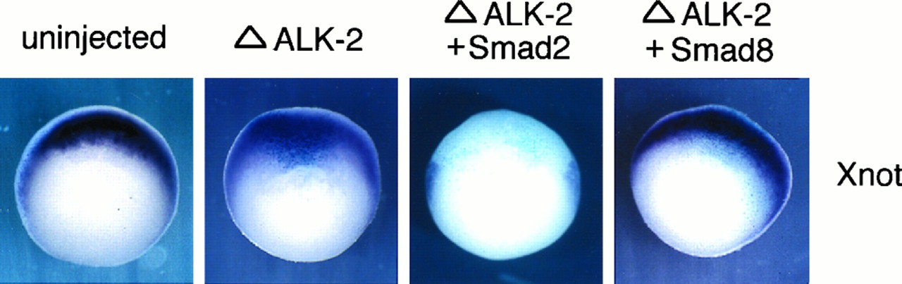Smad8 rescues the block of Xnot by truncated ALK-2. Albino embryos at the four-cell stage were injected in the marginal zone with in vitro transcribed RNA of ΔALK-2 alone or ΔALK-2 with either Smad2 or Smad8. The embryos were cultured until stage 10.5 and used in whole-mount in situ hybridization with a Xnot probe. The lacZ transcripts was used to indicate the distribution of the injected RNA. Representative embryos are shown (vegetal view with dorsal side up).