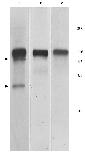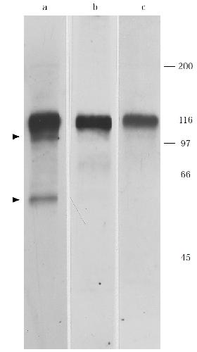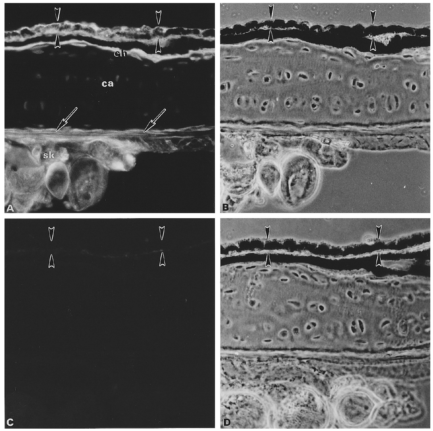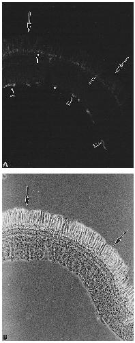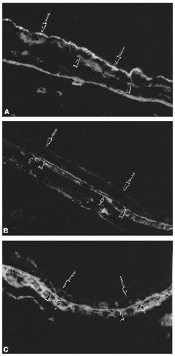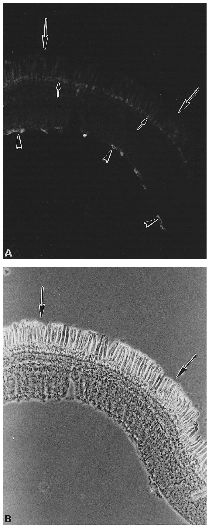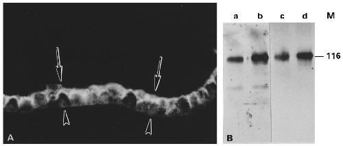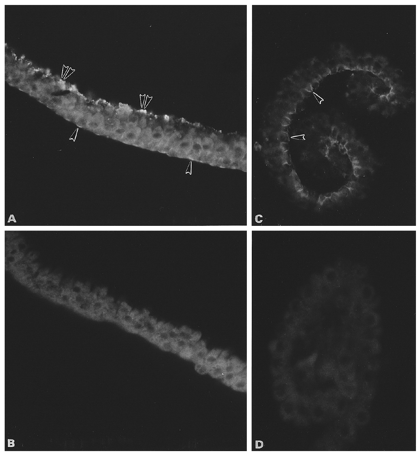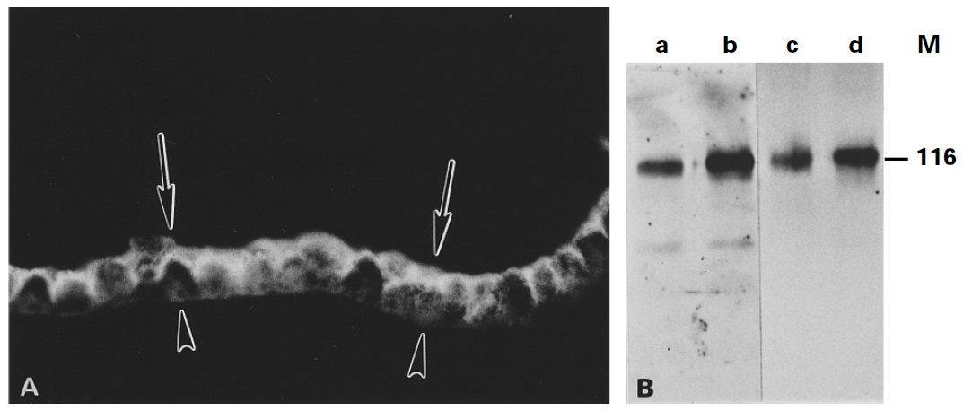 The retinal pigment epithelium (RPE) is a transporting epithelium with polarized membrane domains. A unique characteristic of these cells is that their apical surface does not face a lumenal space, but is directly apposed to a layer of neurons (photoreceptors) and their associated extracellular matrix. Because the interaction occurring at this site is important for retinal attachment and particle phagocytosis, an attempt was made to identify epithelial molecules which potentially could mediate cell-cell or cell-matrix adhesion. In the present report, the subcellular localization of beta 1-integrins, the main receptors for extracellular matrix ligands, has been examined within Xenopus RPE. Several previously characterized antibodies were used in this analysis including: two rabbit polyclonal antibodies directed against purified chick muscle fibronectin receptor (pAbs No. 3818 and No. 2999), and a monoclonal antibody specific for Xenopus beta 1-integrin subunit (mAb 8C8). In Western blots of whole epithelial cell extracts, each of the antibodies intensely labeled a 115 kDa band, consistent with beta 1-integrin reactivity. One of the reagents (pAb No. 3818) also weakly stained unidentified bands of 50 and 100 kDa. Pre-clearing experiments demonstrated that pAb No. 3818 and mAb 8C8 both recognize the same detergent-soluble integrin: when cell extracts were depleted of beta 1-integrin by immunoprecipitation with mAb 8C8, the 115 kDa antigen recognized by pAb No. 3818 was not observed. Consistent with their similar immunochemical reactivities, each of the antibodies produced equivalent immunocytochemical staining of many eyecup tissues, including extraocular skeletal muscle cells, scleral and choroidal fibroblasts and vascular endothelium of the choroid and neural retina. In the native RPE, and isolated sheets of epithelium, however, qualitative differences in labeling between these antibodies were evident. Analysis by confocal microscopy showed that, while all three antibodies stained the basal surface of the epithelium, pAb No. 3818 also strongly labeled the apical microvillar surface. As the adjacent photoreceptors did not cross-react with this antibody in control experiments, the apical RPE staining could not be accounted for as contamination with retinal tissues during isolation. Furthermore, when the apical cell surface was selectively biotinylated in situ, and biotinylated proteins precipitated by streptavidin-agarose, beta 1-integrin was detected by immunoblotting with both mAb 8C8 and pAb No. 3818. This domain-specific material, however, represented only a fraction of the whole cell surface integrin: substantially greater amounts of tagged molecules could be detected when isolated epithelial sheets were biotinylated, most likely representing the basal protein. Based on these results, it can be concluded that beta 1-integrin is present in both basal and apical RPE plasma membranes. Molecules present in the apical membrane may represent components of adhesion receptors responsible for retina-epithelium interactions.