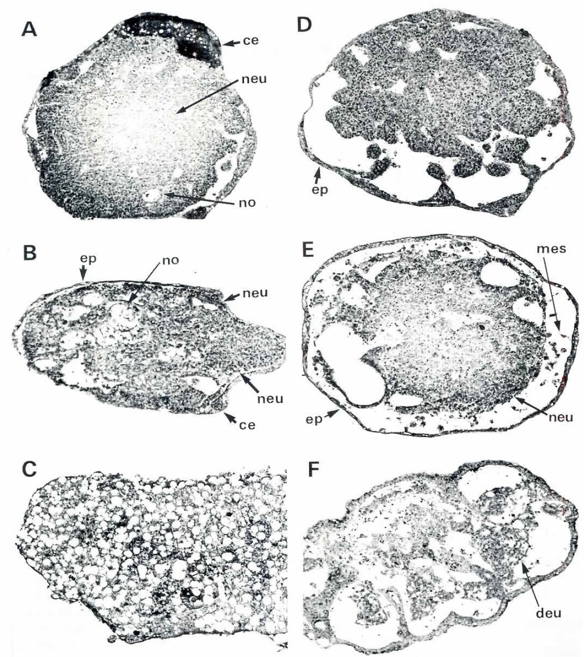 ee, ectoderm (atYPical epidermis); no, notochord; ne, brain structures;